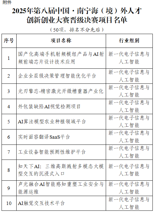 關(guān)于公布2025年第八屆中國·南寧海(境)外 人才創(chuàng)新創(chuàng)業(yè)大賽晉級決賽項目名單的通知 南科通〔2025〕42號(2025-8-26)
