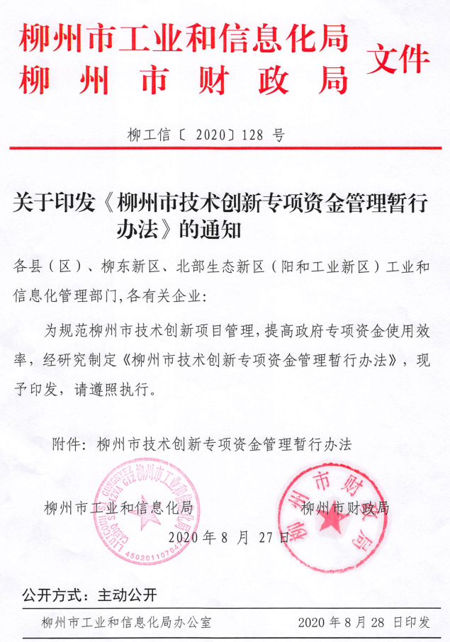 轉(zhuǎn)發(fā):關(guān)于印發(fā)《柳州市技術(shù)創(chuàng)新專項資金管理暫行辦法》的通知(2020-10-10)